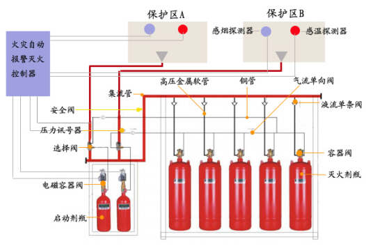 柜式七氟丙烷灭火系统的工作原理:柜式七氟丙烷灭火装置一般与火灾探测器、火灾报警灭火控制器、紧急启/停按钮、声光报警器、放气指示灯等消防设备配套使用。当防护区放生火情,温感、烟感探测器发出火灾信号通过火灾自动报警灭火控制器的逻辑分析后,即发出声光复合报警信号,同时发出联动指令,关闭联动设备,经过一段延时时间后,发出灭火指令,启动电磁型阀驱动器,开启容器阀,释放七氟丙烷灭火剂,实施灭火;值班人员如发现火情后,可按下防护区门外的紧急启动按钮,实施灭火操作;电磁阀型驱动器上还设有手动按钮,紧急情况下还可以进行机械应急手动操作灭火。